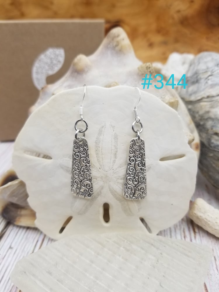 Handcrafted Pure Fine Silver Pendant link I made from Recycled Silver. Silver was created w/ a Curly pattern and then oxidized to give it dimension. Earrings measure little over 1" x .50" from bottom of Sterling earwires.