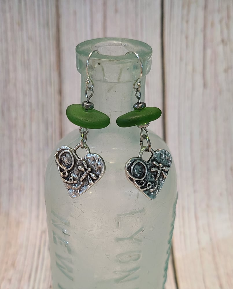 Genuine Green Sea Glass Earrings with Dragonfly Charms and Hematite Beads