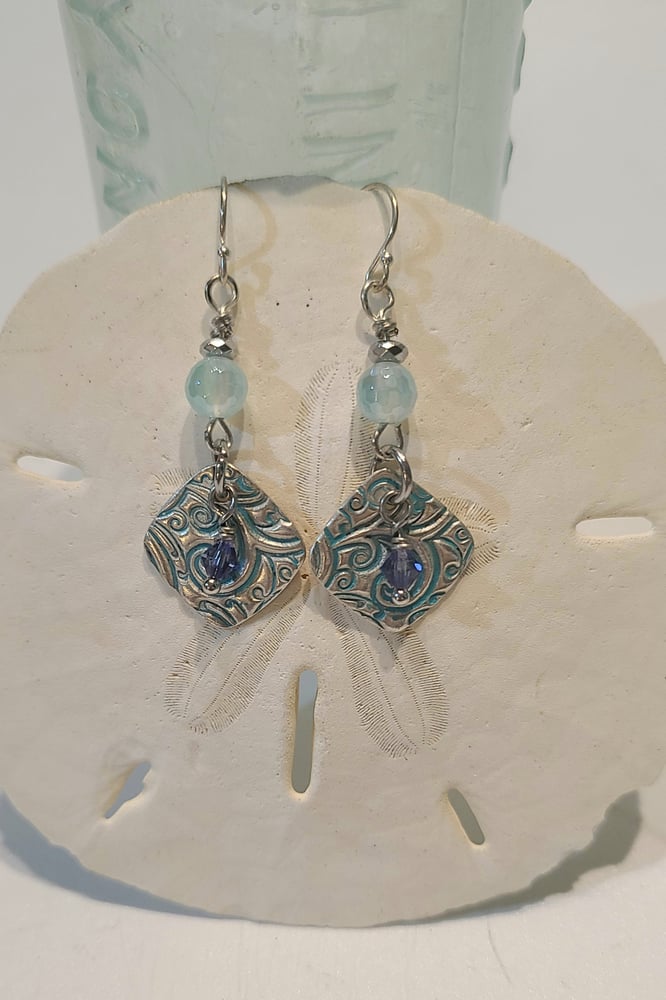 Unique Earrings I made from reclaimed Sterling Silver. I molded a curly tendril pattern into the silver and refired the silver to return it back to pure Sterling Silver. Oxidized to give the design dimension and a teal patina