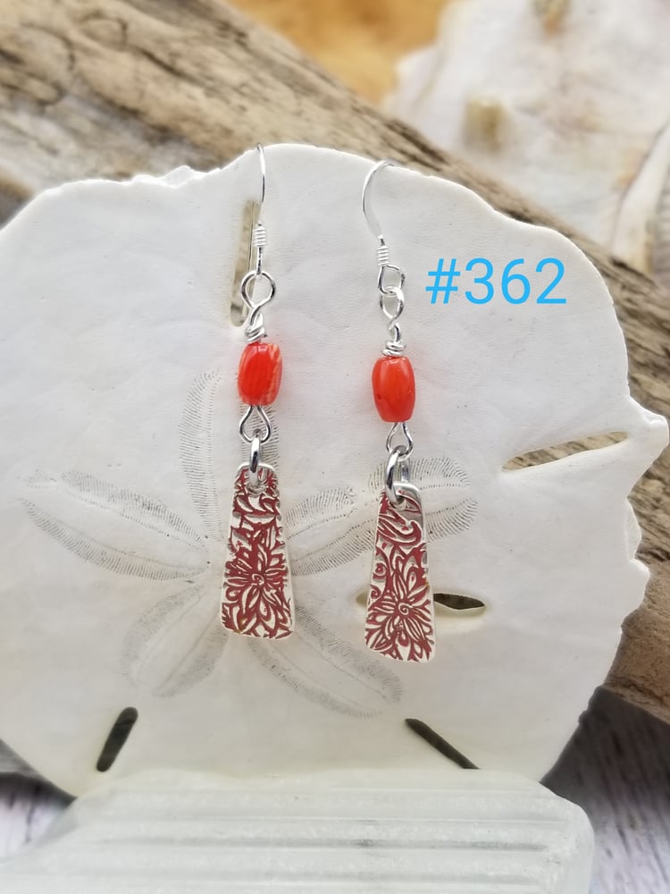 Handcrafted Pure Fine Silver Earrings I made from Recycled Silver. Embellished w/ a genuine Coral bead. Silver was created w/ a abstract floral design and then oxidized to give it dimension. The color of the patina is Garnet. Earrings measure 1.25" from bottom of Sterling ear wires.